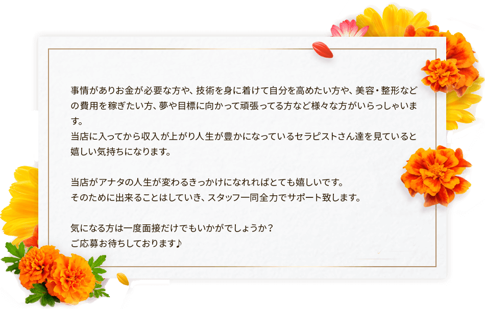 当店は働く女性を第一に考えた働きやすい環境を徹底追及しております。 ★最低保証有り ★未経験者大歓迎 経験者優遇 ★自由出勤 全額日払い |